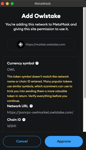- RPC URL: https://jsonrpc-owlmarket.owlstake.com